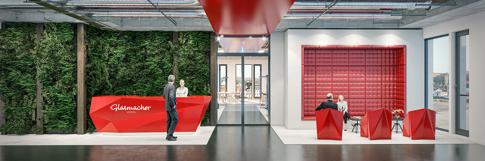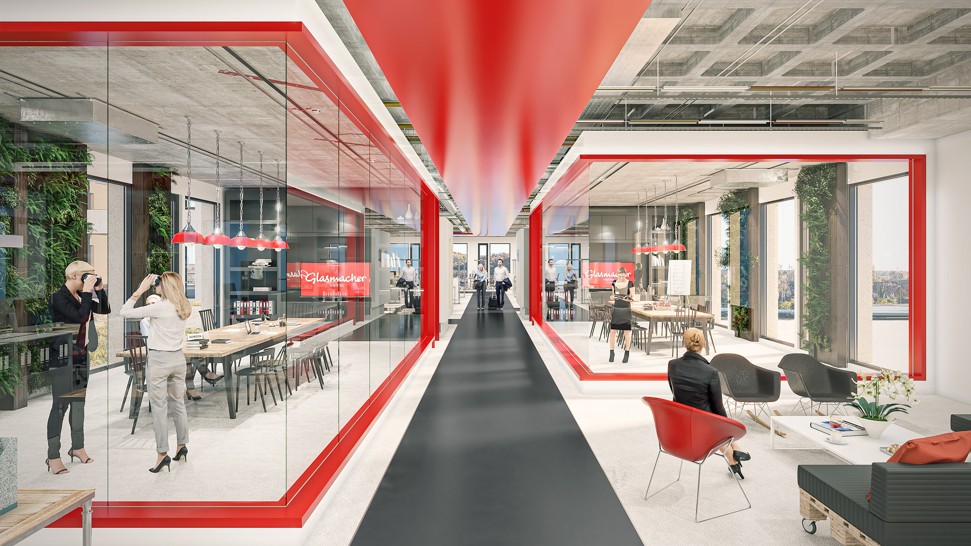 Für die Büroflächen im Turm entwarfen wir das komplette Interior Design. Passend zur Historie des Areals entschieden wir uns für einen coolen Industrial Chic mit Grünwänden und dem Rot des Glasmacherviertels.